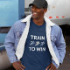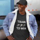 Um design para qualquer um que queira sentir a inspiração para treinar mais. Há três corredores de pictogramas, o centro está na cor dourada de um vencedor, e a legenda é "TRAIN TO WIN". Texto em branco, perfeito para qualquer vestuário de cor escura. (Versão com texto escuro também disponível para roupa branco e claro.)