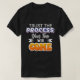 Esta t-shirt preta apresenta a mensagem encorajadora "TRUST THE PROCESS Your Time Will COME" numa combinação de branco, azul com um contorno branco e laranja com fontes de contorno brancas. As palavras são empilhadas e estilizadas para criar um design visualmente atraente e motivacional.