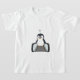 This humorous artwork features an adorable, chubby penguin standing uncertainly on an escalator step. The character wears a puzzled expression with slightly worried eyebrows and rosy cheeks, conveying a sense of being lost or hesitant. A bold question mark floats directly above its head to emphasize the confusion. The illustration includes detailed surroundings of the escalator, featuring grey steps and glass side panels, drawn in a clean cartoon style that captures a relatable moment of navigation in a big city or mall.