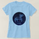 Tee a caracterização do símbolo do zodíaco para o Aries no azul de prata macio, como um medalhão redondo, coberto com as estrelas da constelação, contra um fundo estrelado do céu formando do azul da meia-noite profundo para enegrecer.