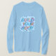 A camiseta apresenta uma design ousada e minimalista com a frase "Construa seu corpo" escrita em uma fonte grande, sans-serif. As letras estão empilhadas umas sobre as outras, criando um sentido de movimento e de ímpeto. O fundo é uma cor azul clara, simples, que ajuda a destacar o texto. O design geral é limpo e moderno, com um forte enfoque na mensagem.