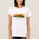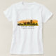 A T-Shirt feminina apresenta a silhueta de linha do horizonte da cidade de Fênix, Arizona, com fundo de escala de cor d'água do pôr do sol e coordenadas de mapa de latitude e longitude.