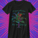 A palmeira muito colorida é verde limão brilhante, caçador escuro verde, azul-aqua, azul-real, fúcsia e vermelho-creme. As palavras "Copacabana" estão acima da árvore bonito e "Rio de Janeiro" está debaixo das frentes de penas. Esta camisa colorida e divertida irá transportá-lo para o modo de férias. Celebre esta incrível praia de resort no Brasil com esta camisa única.