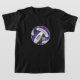 Esta divertida equipe de voleibol colore t-shirt para raparigas com uma equipe personalizada e um nome de mascote escolar apresentam a imagem realística estilizada de um voleibol roxo, preto e branco que tem um padrão caleidoscópico floral artístico misturado com os seus painéis roxo e preto - o seu nome e nome da equipe são personalizáveis, tal como o seu número de camisola - por katz_d_zynes