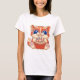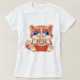 Um gato de desenho animado com olhos grandes e brilhantes está balançando uma pizza enfeitada de peixe e outros sapos. O uso lúdico de cores e recursos exagerados adiciona um toque caprichoso.