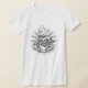 o t-shirt das mulheres do V-pescoço com design do tatuagem. Entregue o coração sagrado tirado com rosas, chama e luz da irradiacão. A inscrição abaixo lê de "soros Venit Cineri Gloria" (a glória vem ao morto demasiado tarde).