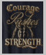 O design apresenta o texto em negrito "Coragem empurra força" em uma fonte real e serif. As palavras são traduzidas numa rica paleta de cores profundas e reais, criando uma estética majestosa e poderosa. O design está centrado num fundo azul claro e sólido, que proporciona uma canvas limpa e moderna para a mensagem.