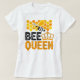 Esta camiseta branca apresenta um design lúdico com uma abelha de desenho voando perto de um aglomerado de favos de mel amarelo e laranja no topo. Abaixo, a palavra "BEE" é escrita em caracteres negros, ligeiramente angustiados, cortados com uma coroa ouro. Abaixo, "QUEEN" é exibido em uma fonte cor de laranja cintilante.
