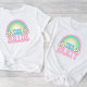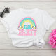 Camiseta de festa de solteira engraçada e engraçada inspirada no hippie para as damas de noiva e amantes com "A festa" em uma grande fonte azul-rosa e cor-de-rosa, ilustrações de flores de pop-arte estilo 70 e um arco-íris rosa, azul, verde e amarelo. Selecione sua cor e estilo de t-shirt. A camiseta "A Noiva" está disponível para a noiva.