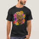 Minha coruja está sentada entre uma buquê de flores coloridas de verão num pano de fundo preto
