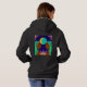 At the center, a prominent moon dominates the composition, with a striking half-yellow, half-cyan appearance, hinting at phases or the interplay of light and shadow. Above and below, stylized sun motifs in purple and orange further emphasize the cosmic theme of duality—day and night, light and dark, masculine and feminine energies. The dark blue background, dotted with stars, reinforces the celestial setting.