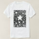 Um desenho preto e branco estilizado de um cosmos com estrelas, galáxias, planetas no fluxo maelstrom da gravidade e do continuum do tempo espacial.