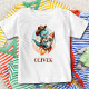 Esta camiseta personalizada apresenta um dinossauro T-Rex hilariamente aventureiro. Nosso pequeno dinossauro doma um rodeio espacial, usando um chapéu de cowboy clássico inclinado sobre um capacete de astronauta elegante. Ele cavalga um poderoso foguete espacial como um cavalo bronco, estrelas girando ao seu redor em uma aventura cósmica. Personalize esta camisa com o nome da criança para um presente verdadeiramente fora deste mundo!