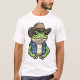 Cartoon green frog with a cowboy hat and blue denim vest; bold, retro Western flair, vibrant colors, playful personality for kids and casual apparel collections.