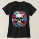 Um crânio humano cercado por flores vermelhas, brancas e azuis faz uma camiseta fantástica para o Halloween. Perfeito para aqueles que celebram o Halloween todos os dias, com uma vibração Gótico e escura.