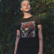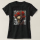 Na moda e camiseta de cor escura confortável. Um fundo de arte vintage de folhas rasteiras e um crânio retrato com cabelo crespo, decorado em rosas vermelhas lindas. Um leve olhar texturizado com um toque moderno. A moda de roupas íntimas, Gótico, Halloween, e tudo o que há entre eles fazem disto uma adenda ao seu armário.