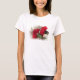 Esta incrível camiseta de espaguete de espaguete apresenta dois brilhantes cravos vermelhos em um fundo de tecido de brocado branco-pérola.