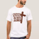 Esta camiseta branca apresenta um design ousado, inspirado na fé, de cor castanha escura. As palavras "FORMAÇÃO CRUZADA" são empilhadas do lado esquerdo, com "FORMAÇÃO" ligeiramente menor e sublinhada. À direita do texto está uma silhueta proeminente de uma cruz cristã. Abaixo de "TREINAMENTO", aparece o verso da Bíblia "JOHN 3:16". Este design usa, de forma inteligente, o termo "treino cruzado" para aludir ao crescimento espiritual e faz referência a um verso significativo sobre a salvação.