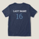 Custom Front and Back Football T-Shirt - shown in navy blue Design features script "Football" with text that can be customized for the team name, player last name, and jersey number. White, blue, and gray colors can be customized.