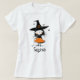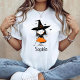 Whimsical Halloween artwork featuring a sweet little witch with a wide hat, orange skirt, and playful hand-drawn details. The black-and-orange palette and charming character design create a fun, festive look suitable for a variety of Halloween-themed products.