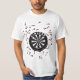 t-shirt criativa de um jogador de dardo, com conselho de dardo e corações únicos, com a palavra: Implacável.