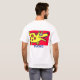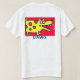 Tem um nome no bolso dianteiro e na parte traseira tem uma imagem de um cão cómico com um lugar para que você pnha um nome