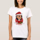 Camiseta feminina ilustrada por uma menina feliz sorridente e de cabelo preto longo, ela está vestindo a fantasia vermelha e branca do Papai Noel e segurando um presente; com texto editável modelo para seu nome ou mensagem, design de Natal com fundo vermelho