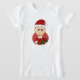 Camiseta infantil com ilustração de uma garota sorridente e bonita com cabelo louro, a garota está vestindo uma fantasia de Santa Cláusula com um chapéu vermelho e segurando um presente. Com um círculo vermelho no fundo
