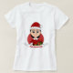 Camiseta feminina ilustrada por uma menina feliz sorridente de cabelo preto curto, ela está vestindo fantasia vermelha e branca do Papai Noel e segurando um presente; com texto editável modelo para seu nome ou mensagem, design de Natal com fundo vermelho