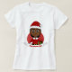 Camiseta feminina ilustrada por uma linda e sorridente menina negra feliz com cabelo curto, ela está vestindo fantasia vermelha e branca do Papai Noel e segurando um presente; com texto editável modelo para seu nome ou mensagem, design de Natal com fundo vermelho