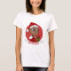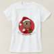 T-shirt feminina, ilustrada por uma menina ou um rapaz preto feliz sorridente, o bebê está a vestir roupas vermelhas e brancas e a segurar um presente; com um modelo de texto editável para o seu nome ou mensagem, design de férias de Natal