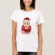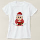 Camiseta feminina ilustrada por um sorridente e feliz rapaz loiro, ele está vestindo fantasia de Papai Noel vermelho e branco e segurando um presente; com modelo de texto editável para seu nome ou mensagem, design de Natal