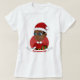 Camiseta feminina ilustrando um menino feliz sorridente e bonito com óculos, ele está vestindo fantasia vermelha e branca do Papai Noel e segurando um presente; com modelo de texto editável para seu nome ou mensagem, design de Natal