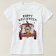 Celebre a temporada de Halloween com esta camiseta de Halloween fofa. Apresenta uma ilustração em aquarela de um caminhão pickup vermelho antigo com três gnomos na parte de trás, junto com algumas abóboras e um gato preto. Morcegos voando completam a cena de outono de Halloween. Acima, a citação Feliz Halloween em tipografia preta.