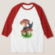 Um cão preto pequeno espreita para fora de um remendo de cogumelos vermelhos nesta camisa do divertimento.