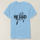 Celebre seu noivado com esta encantadora camiseta azul clara com a frase divertida "Ele Disse Sim." O design inclui uma combinação de letras maiúsculas em negrito e fontes cursivas elegantes, acentuadas com um simples gráfico de ramo de folhas. A tipografia preta se destaca lindamente contra o fundo azul pastel, tornando esta camisa uma escolha perfeita para festas de noivado, eventos de casamento ou simplesmente para o dia a dia para compartilhar suas felizes notícias. Mostre sua história de amor única com esta camiseta estilosa e significativa.