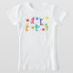 Uma camisa de festa de aniversário de trampolim divertida e colorida. As cores roxa, rosa, verde e azul. A design apresenta silhuetas de meninas pulando no ar ao redor de balões e confetti. Excelente para as meninas vestirem durante uma festa de trampolim.