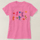 Uma camisa de festa de aniversário de trampolim divertida e colorida. As cores roxa, rosa, verde e azul. A design apresenta silhuetas de meninas pulando no ar ao redor de balões e confetti. Excelente para as meninas vestirem durante uma festa de trampolim.
