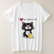 Senhoras mais camiseta branca de tamanho, com um tuxedo preto e branco, de desenho animado, com uma bola de fio amarela. O texto preto diz que eu (coração) meu gato de smoking, onde um coração vermelho substitui a palavra amor.