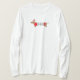 Adorável Dachshund de Natal com HO HO HO cortado. Ele está vestindo um bonitinho chapéu de bolinhas vermelho e branco e suéter para se manter quente.