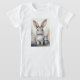 Camiseta da garota com dois adoráveis coelhos sentados lado a lado com expressões alegres em meio a um fundo suave e natural. As cores gentis e a folhagem delicada ao seu redor criam uma cena serena e encantadora.
