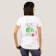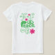 Design de camisa original verde e rosa que inclui a palavra "paz", um sinal de paz, espirais e flores.
