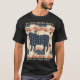 Camiseta com estrelas e listras dirige e mensagem sutilmente humorística: "Você entende o que há no bife aqui?" O gráfico tem uma sensação de safra. A mensagem nesta camiseta é perfeita para vegetarianos e ativistas do clima.