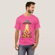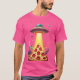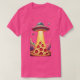 Um disco voador raptando uma fatia gigante de pizza de pepperoni com um feixe de queijo brilhante, estilo de desenho animado, cores vibrantes, fundo cósmico, vibrações retrorreflectoras