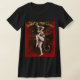 Esta camiseta é ilustrada com uma dançarina do diabo corada colocada sobre um fundo vermelho com o texto "Dança a noite fora"