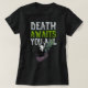 A dark and ominous design featuring the bold phrase “Death Awaits You All,” perfect for fans of gothic themes, horror aesthetics, and intense dramatic artwork.