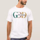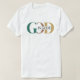 Esta camiseta branca exibe com destaque a frase "DEUS É BOM". A letra "G" é apresentada numa matiz verde, o "O" num marrom mudo e o "D" num amarelo mostarda. As palavras "IS GOOD" são mais pequenas e posicionadas dentro do "O", traduzidas a preto.