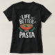 Este vestuário preto apresenta o texto "LIFE é MELHOR com PASTA" numa letra branca e negrito, com uma ilustração cartoon de uma tigela vermelha cheia de esparguete, molho de tomate e manjericão, com um garfo. As decorações de folhas verdes moldam a tigela. É um design simples e entusiasmado para amantes de massas.