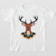 The deer's neck is decorated with a colorful and rich ornament with geometric and floral patterns in shades of black, turquoise, red, yellow and white.