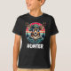 Uma ilustração humorística de um veado vestido de caçador, misturando charme de floresta com uma reviravolta brincalhona. O veado veste uma jaqueta e um boné de camuflagem, completos com óculos escuros refletores, dando-lhe uma aparência legal e aventureira. Personalize esta camisa com o seu nome no verso. Altere ou remova a palavra Hunter, se desejar.